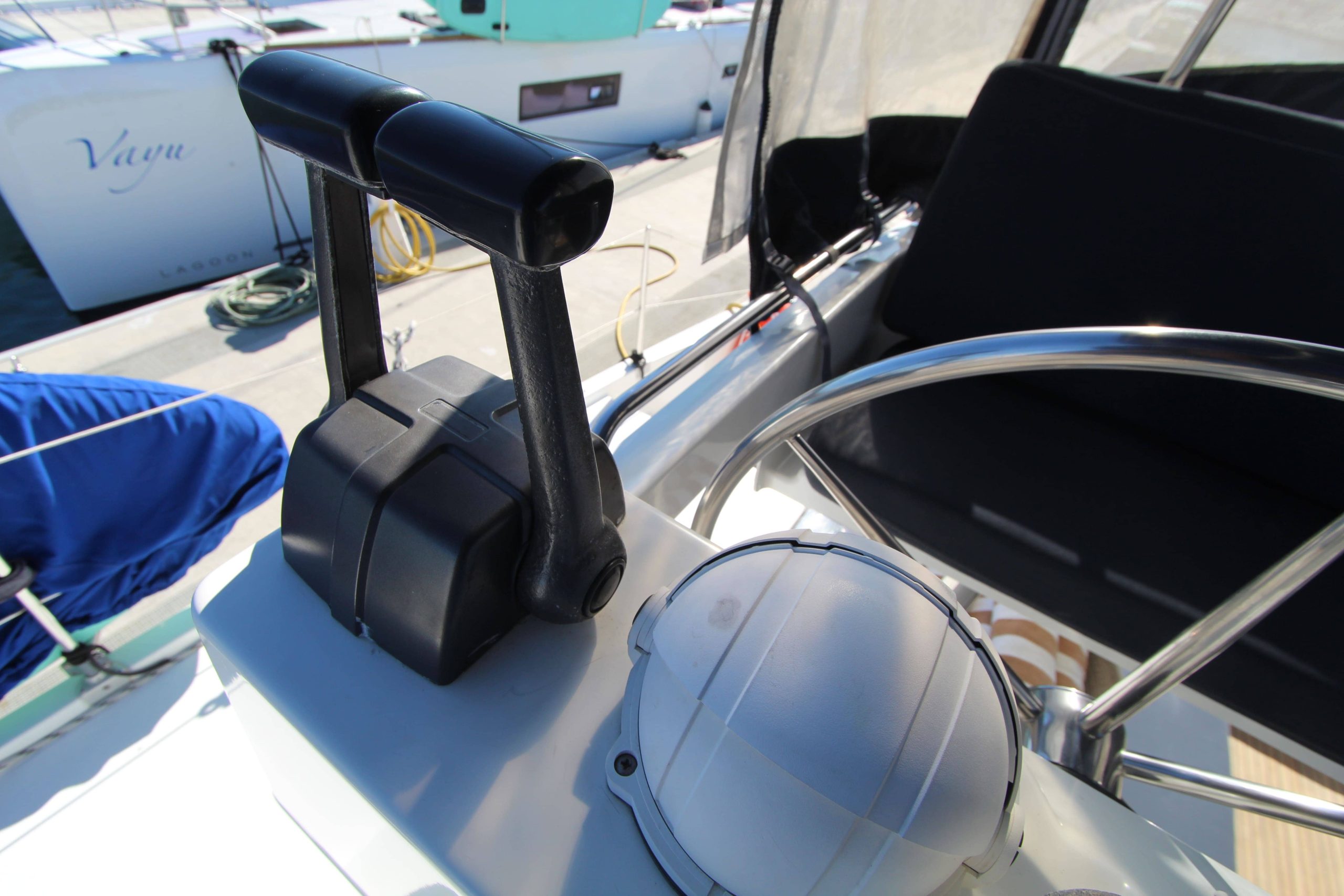 From the aft deck wide steps lead to immediate engine access hatches and let into an top deck that extends aft covering aft deck space and a starboard helm station with sail controls separated from the helm by a walkway. With ample room to work the halyards with a set of manual and electric winches