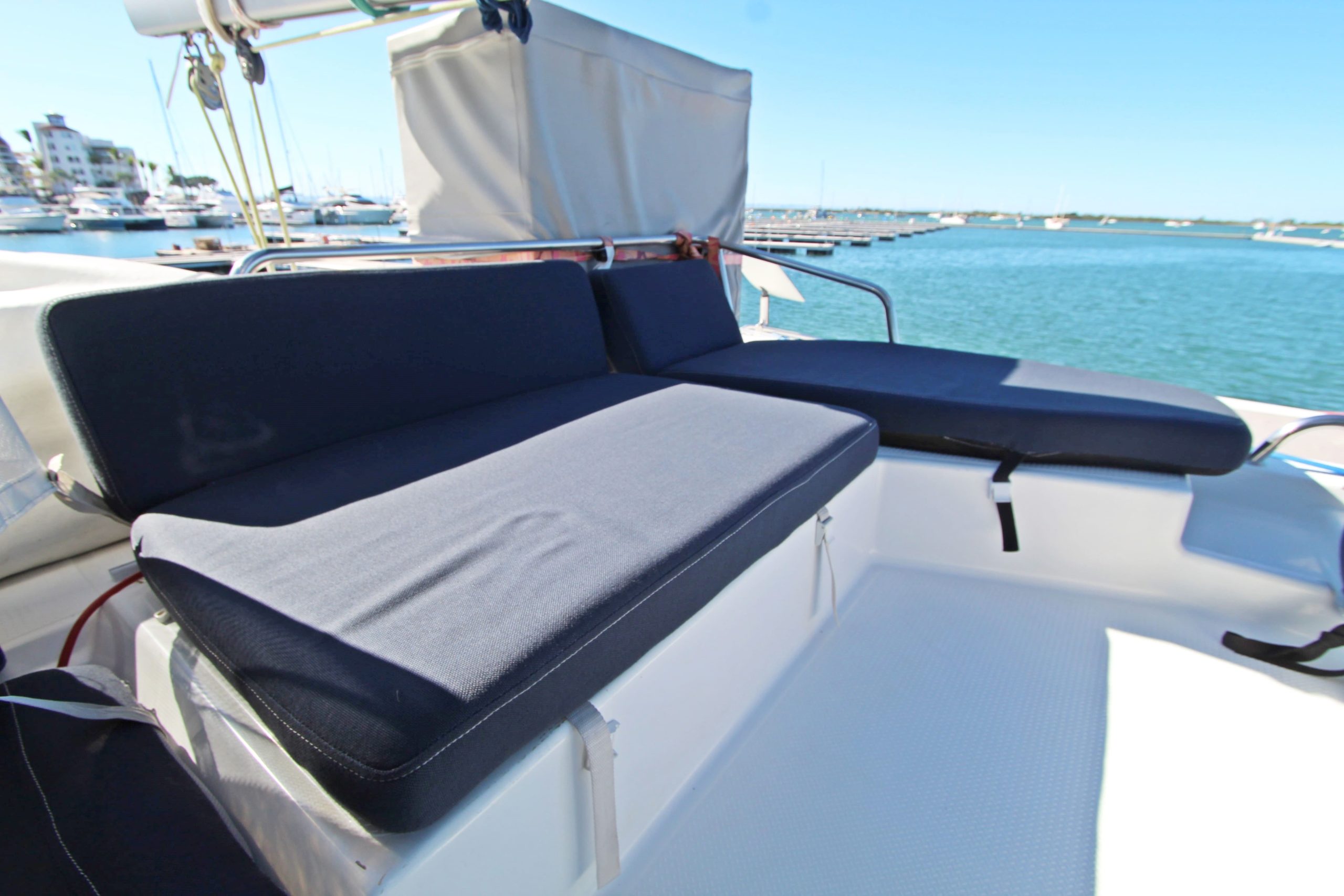 Stairs aid either to the center of the aft deck as well as the huge sun-deck area, custom cushions allow a safe low nook midship under the sails and extra sun-tanning area under more cushions and double trampoline aft.
