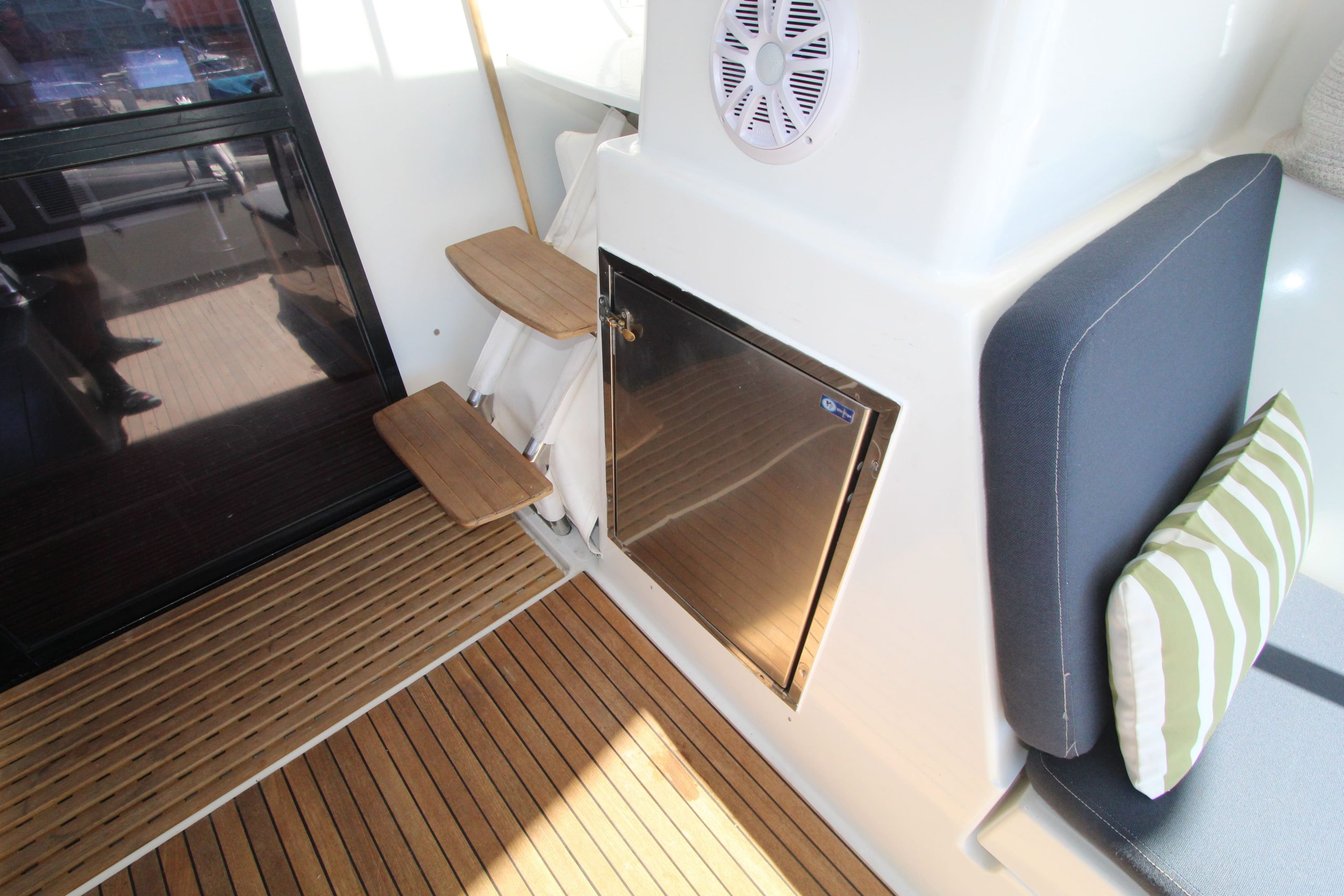 In the aft deck, the heart that makes the Helia crown pleaser, a dinette. that comfortably seats ten under a ventilated and well illuminated area. Al fresco meals are provided by a central galley accessed through sliding doors into to the closed quarters, this gourmet lab is equipped with a four burner professional stove and oven while the fresh eats are supplied by three freezer cabinets meals are concocted at crux of the boat where ample counter tops allow for a celebrity chef-style presentation vía a sliding window that faces directly into the outside seated crowd