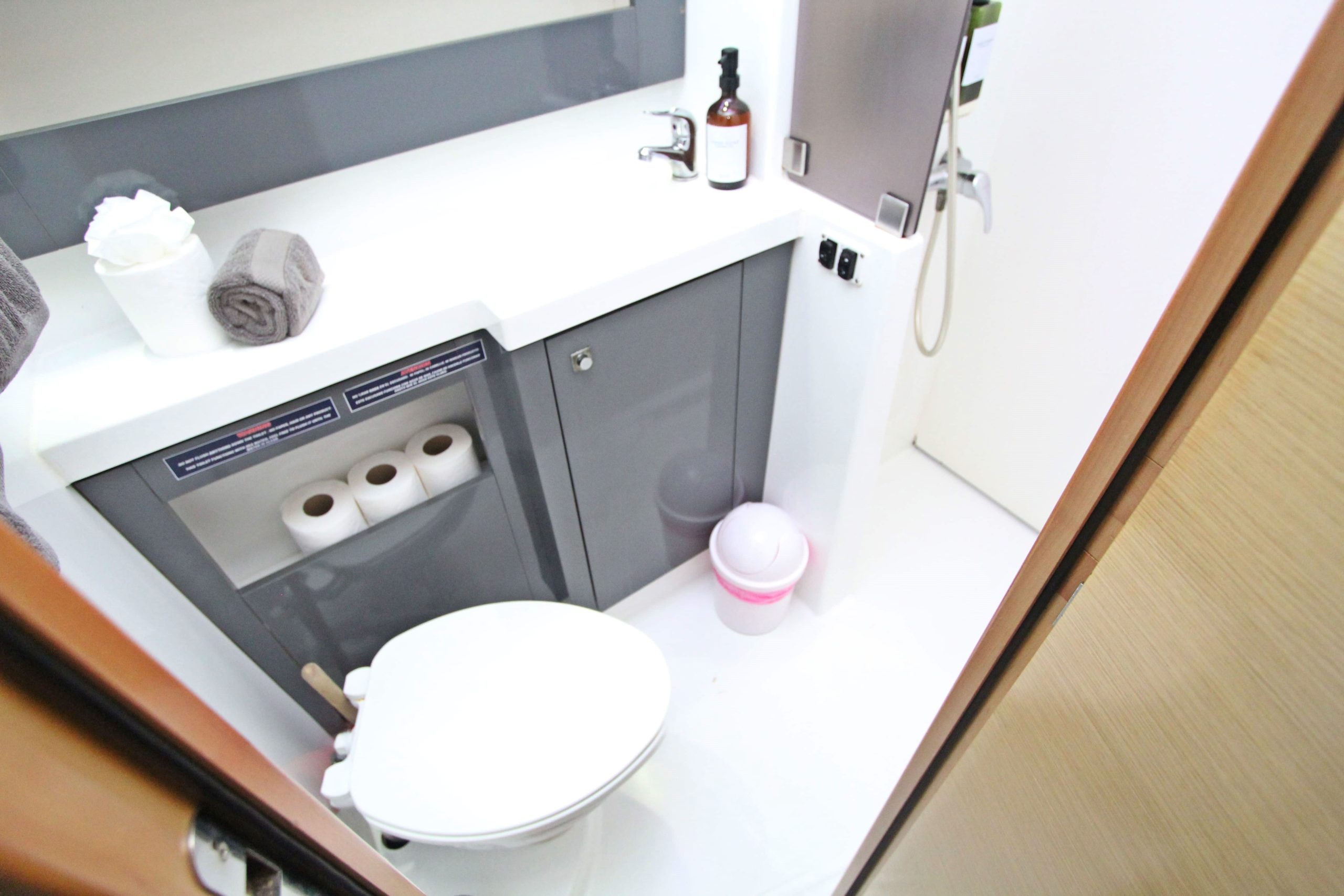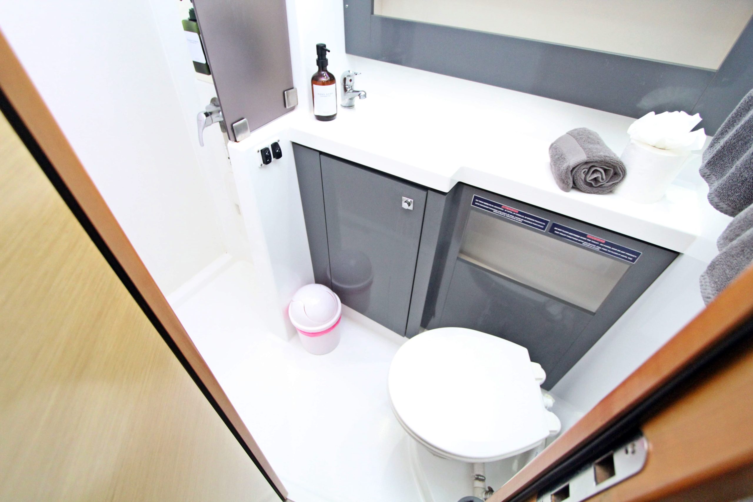 Climbing down across to the guest accommodations on either hull brings you into a mirrorlike equally comfortable area with two equally spacious cabins with double beds; alongside, four en-suite full bathrooms with pressurized water and electric heads providing unique hotel-like experience for a boat in its class.