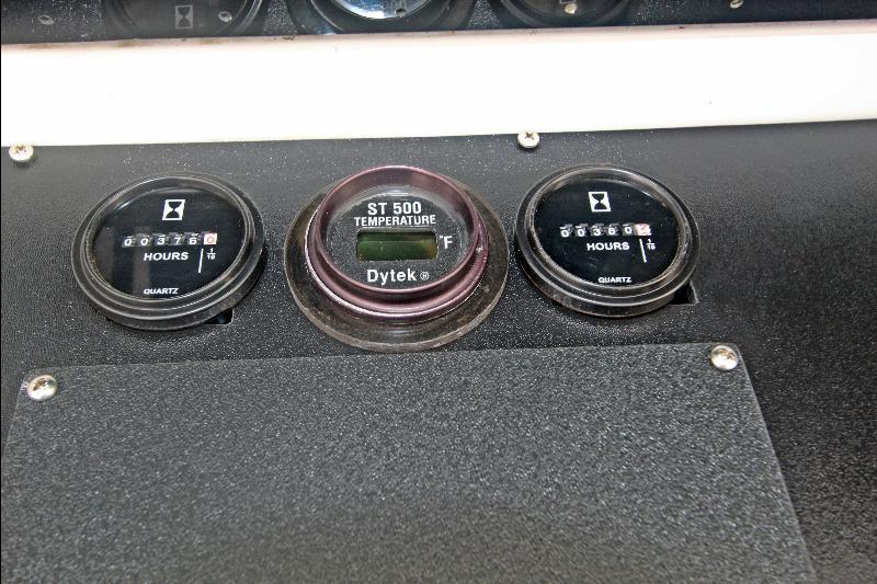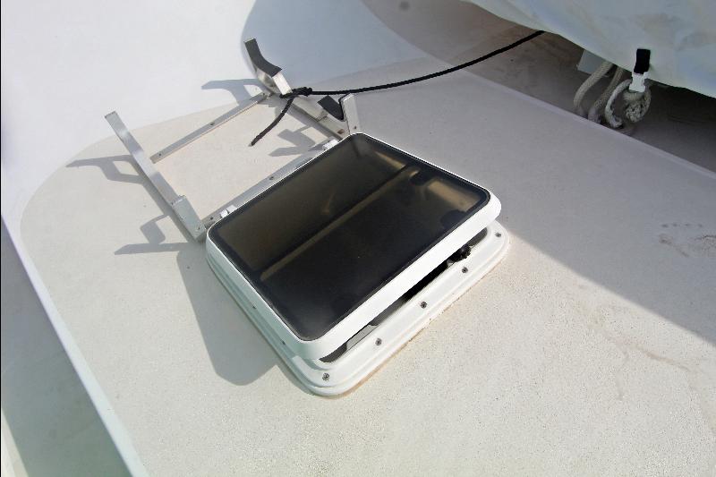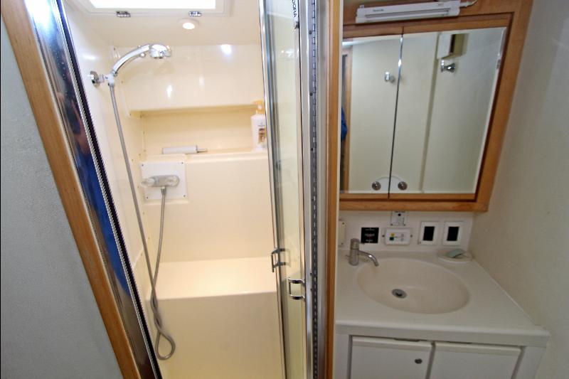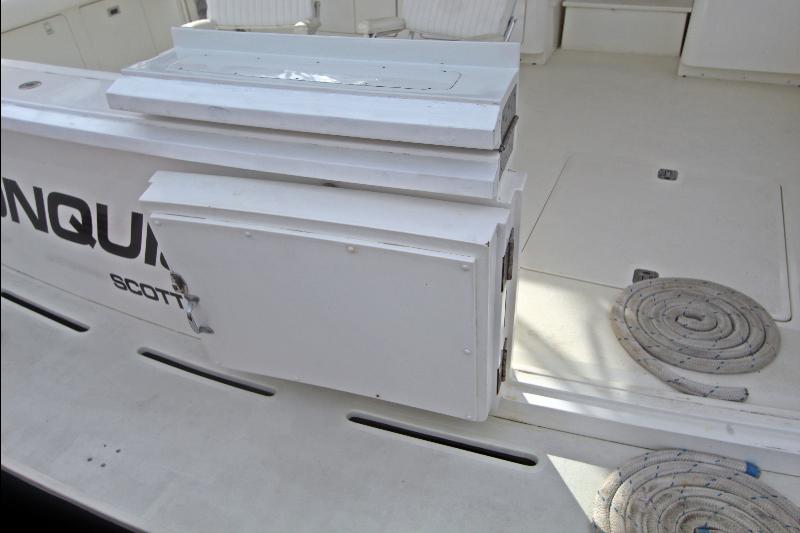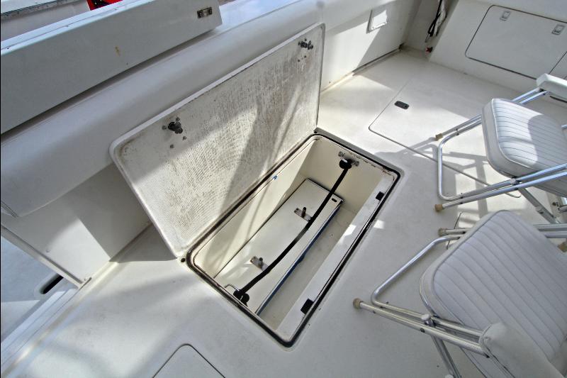 The spacious fly bridge is accessed via a ladder to port of the cockpit, and features two Rupp helm seats, and L-shaped lounge forward of the helm, with a flip-up table for dining or drinks. The bridge has a hardtop and is fully enclosed, with the option for flip-up panels to open and allow fresh air. The large cockpit is all business, with molded tackle center with sink, bait tank, and freezer along the forward bulkhead, and ease of access to the foredeck as well as through the transom door onto the fiberglass swimstep.
