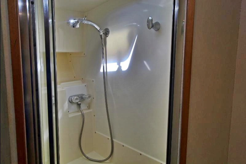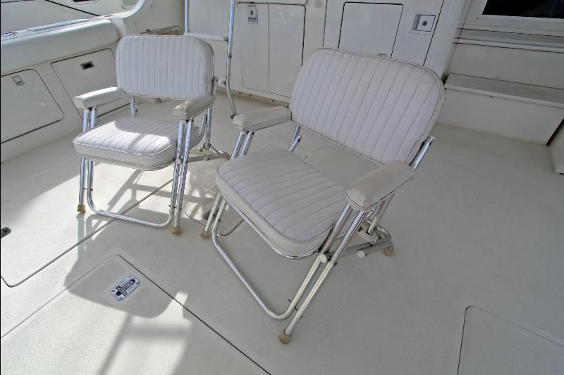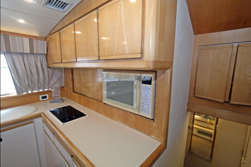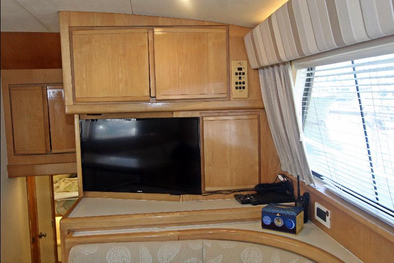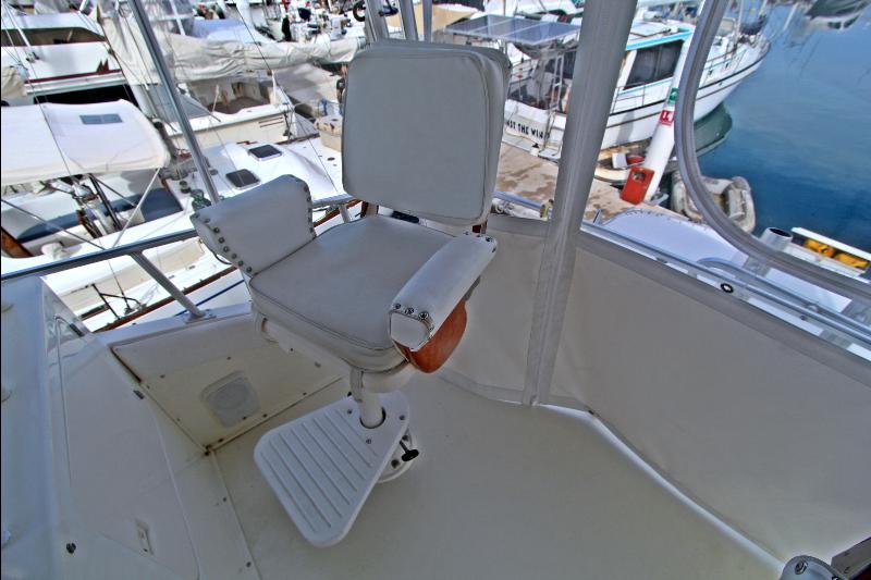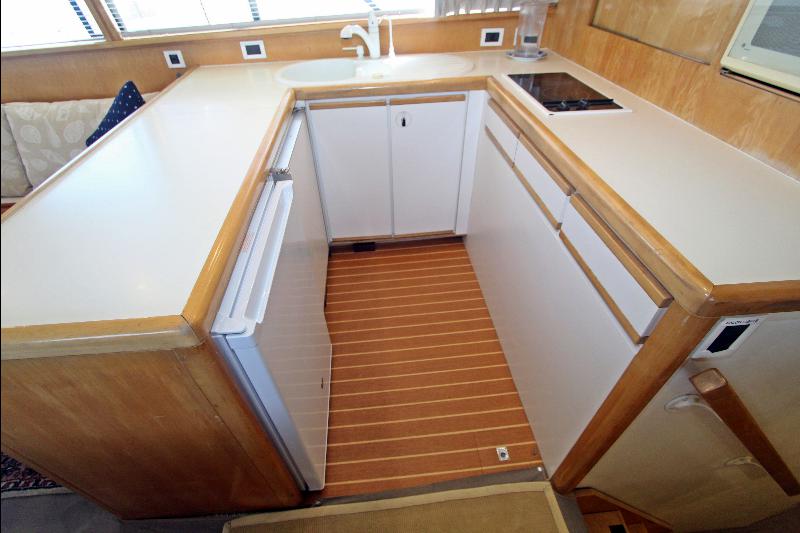 Galley-up model, with large L-shaped settee to port, hi-lo table, and occasional chair to starboard. Forward of the carpeted salon to starboard is the comfortable dinette. Large windows with mini blinds, let in light and the view, with draperies for privacy. Overhead rod locker, stowage lockers to starboard, and stowage under the settee provide area for provisions and fishing equipment.