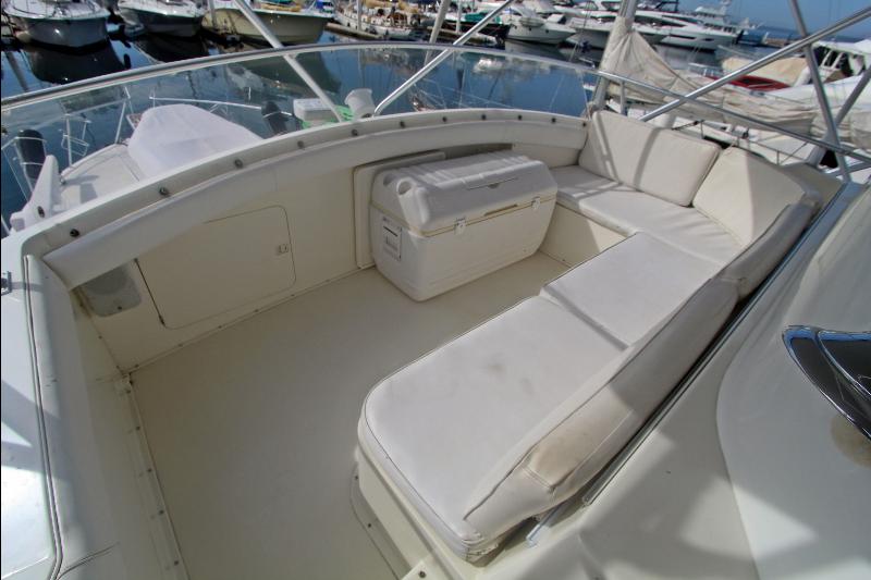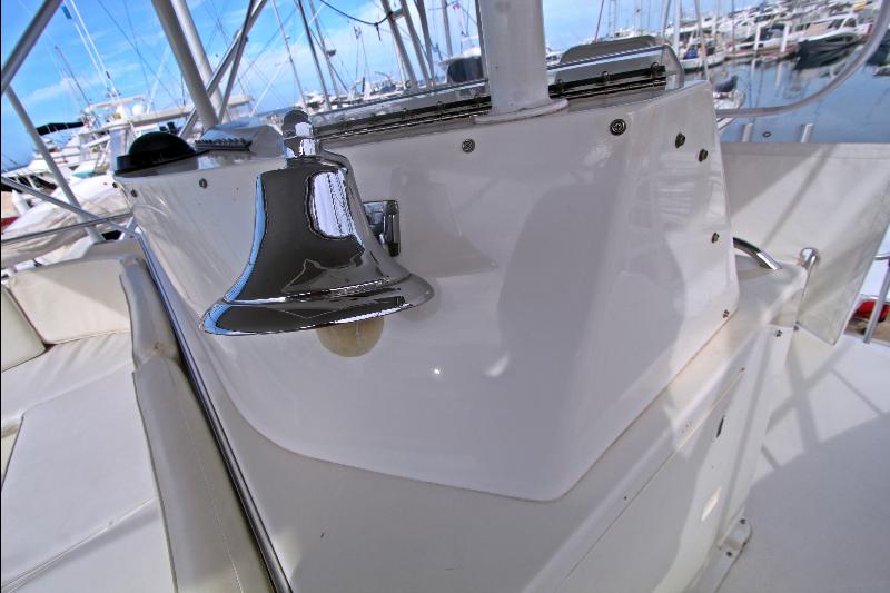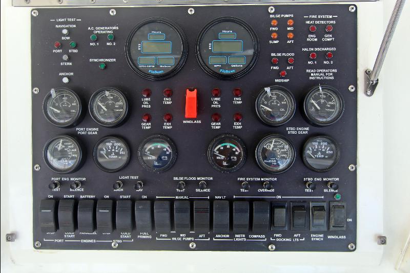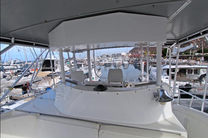 Inside, CONQUISTADORA impresses with a warm satin-maple interior, a spacious salon with entertainment center, a U-shaped galley with Sub-Zero refrigeration, and full climate control via multiple SMX A/C systems. Additional comforts include a full-size washer/dryer, central vacuum, abundant storage, and newly updated soft goods throughout the staterooms.