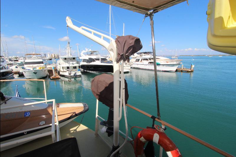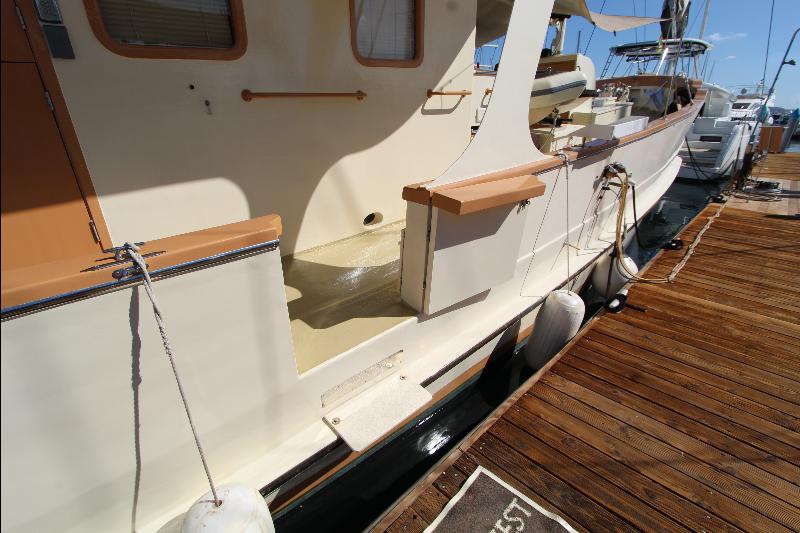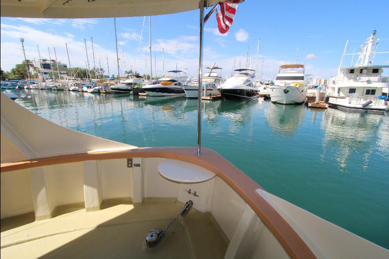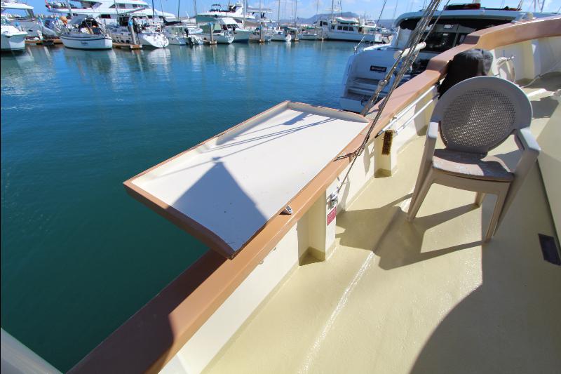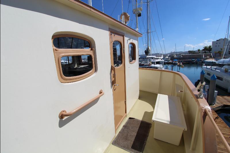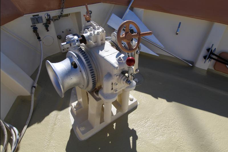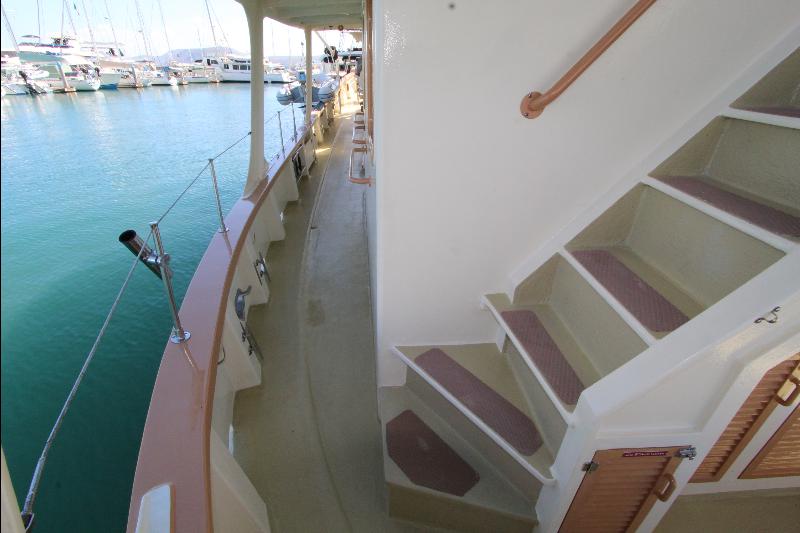 Going aft are the weather (side) decks leading to the aft deck that consists of an electric capstan, cleats and stern anchor. There are stairs leading to the upper deck to the wheel house.