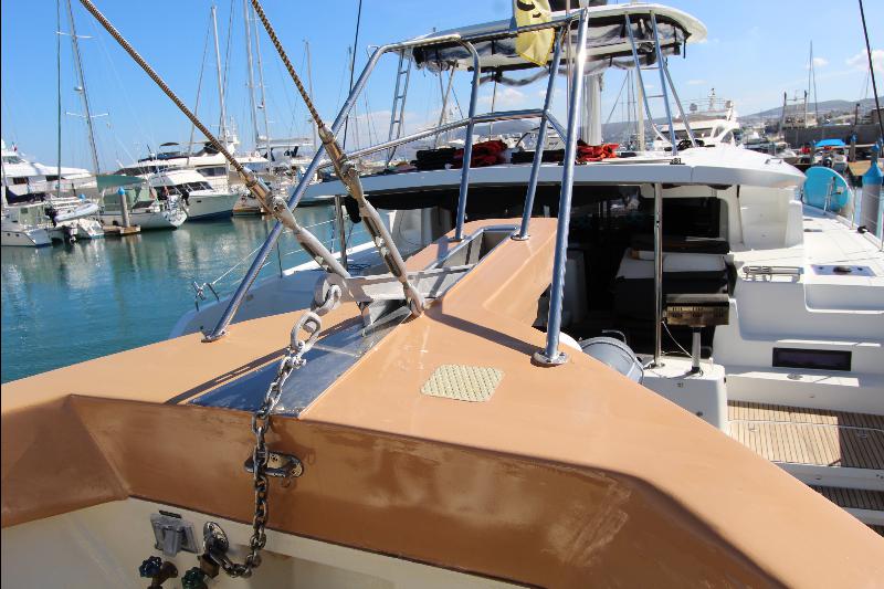 The Fore deck has high bull works with cap rails, two anchors mounted and ready to deploy, and a large hydraulic windlass. On the cap rails are heavy duty chocks, hawse holes in the bull works, cleats on deck, and large fenders mounted on the bull works. Moving aft is the forward companionway with lockers on each side and the mast and boom that is used fore hoisting the dingy and wave runners aboard.