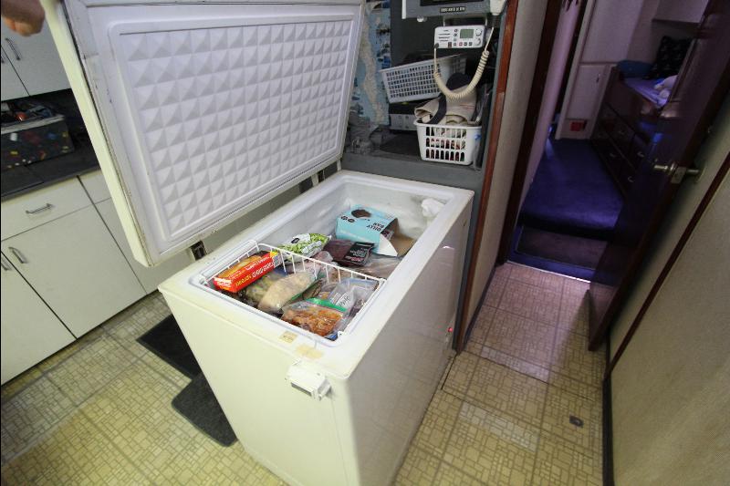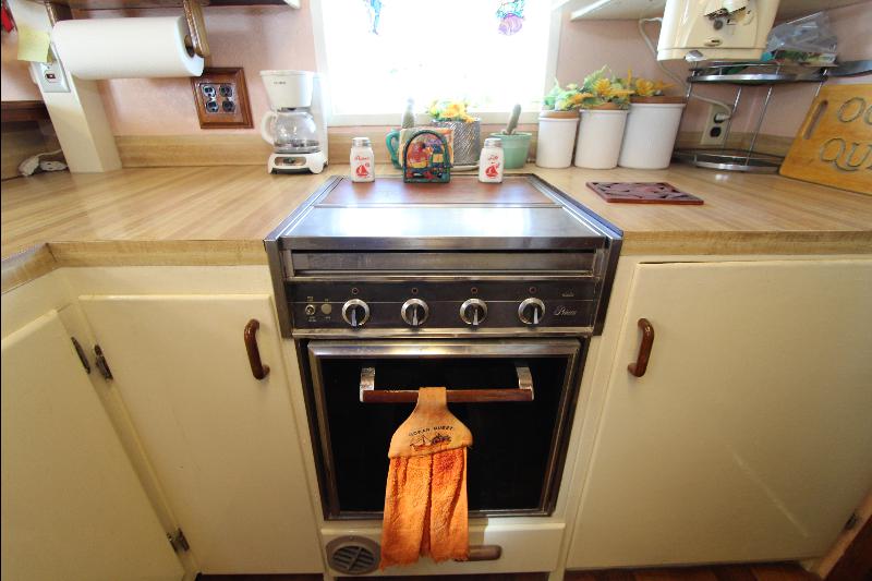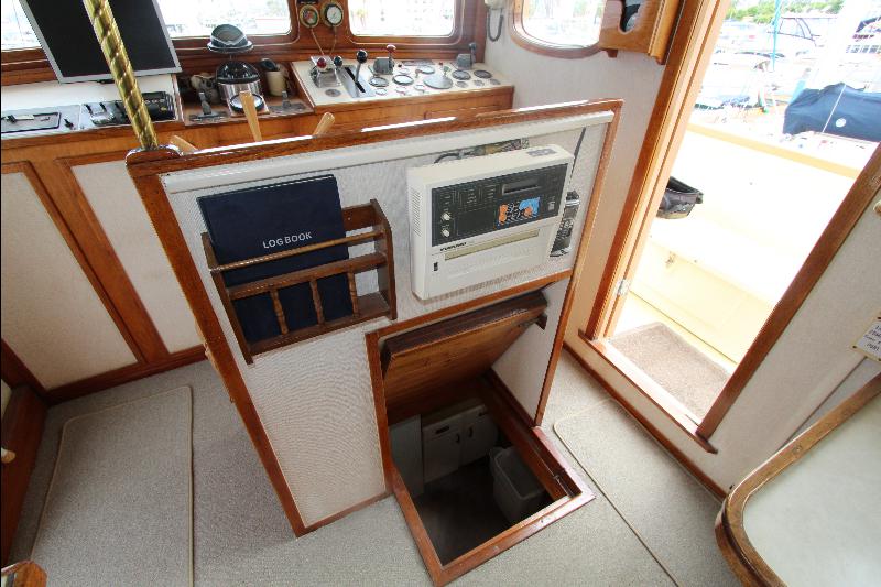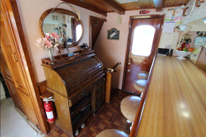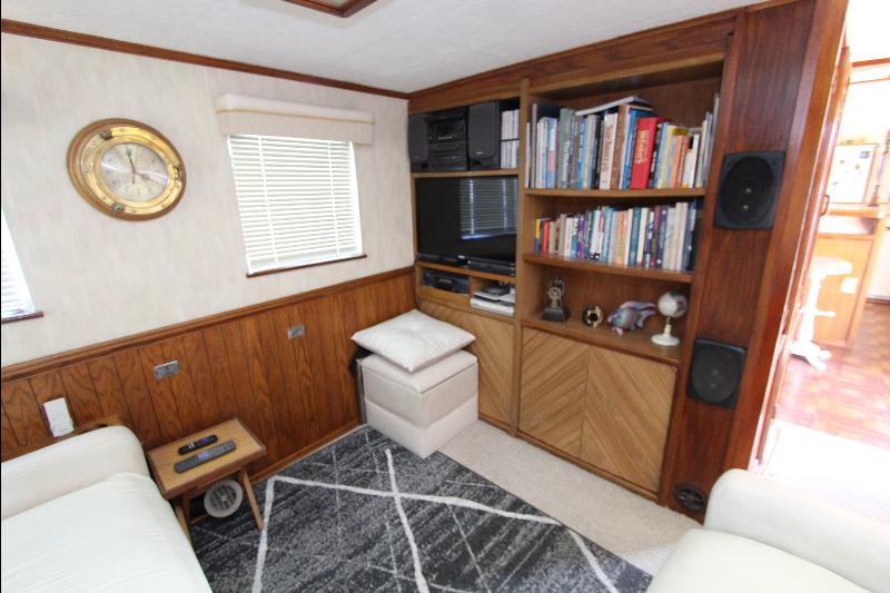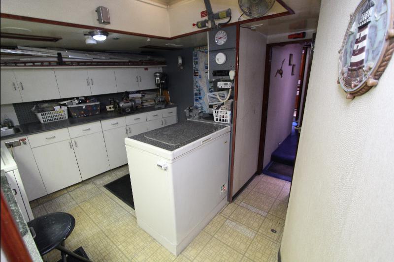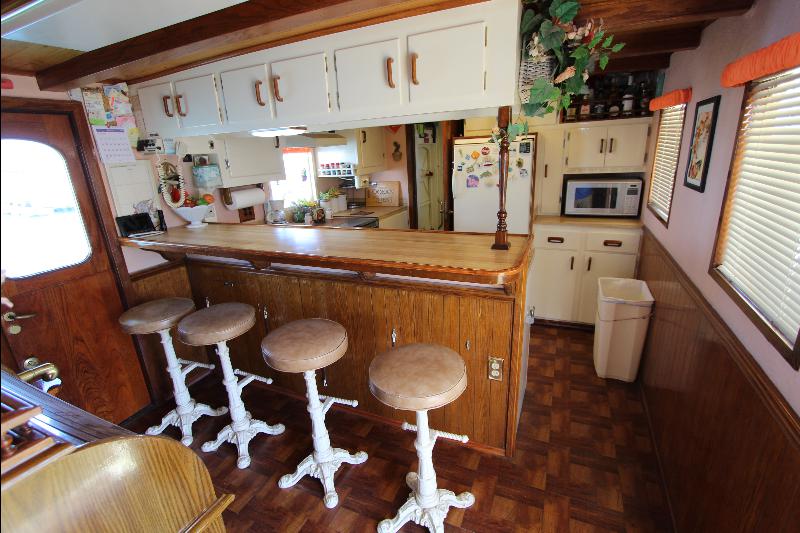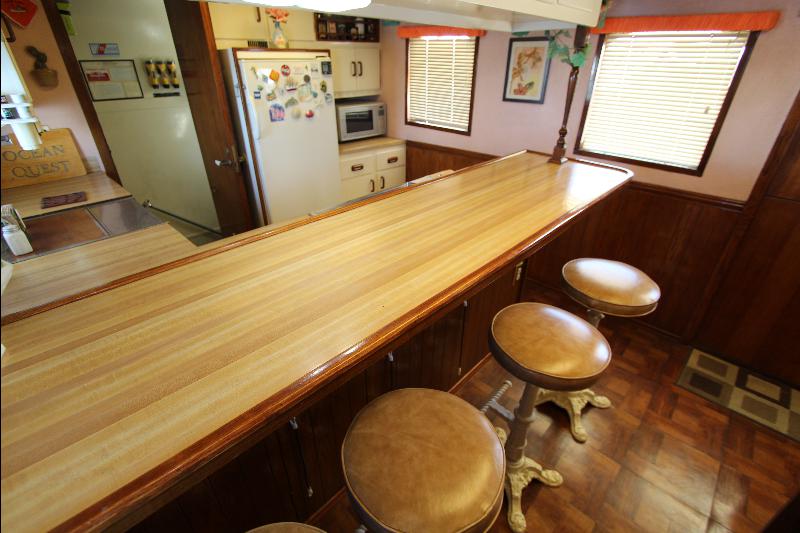 The galley has on the starboard side a stand up refrigerator, freezer and cabinets, on the port side a door that leads to stairs going down to the living quarters forward, a cabinet, stove and a long bench athwart ships with a double sink. Aft of the bench is a long bar counter with 4 stools and side doors to the weather decks. Center behind the bar stools is a roll top desk, on the port side is access to the master state room on the lower deck, aft of the galley is the main salon, with a music center, books, cabinets and an L shaped settee.