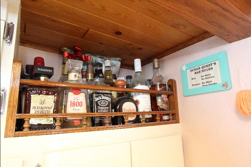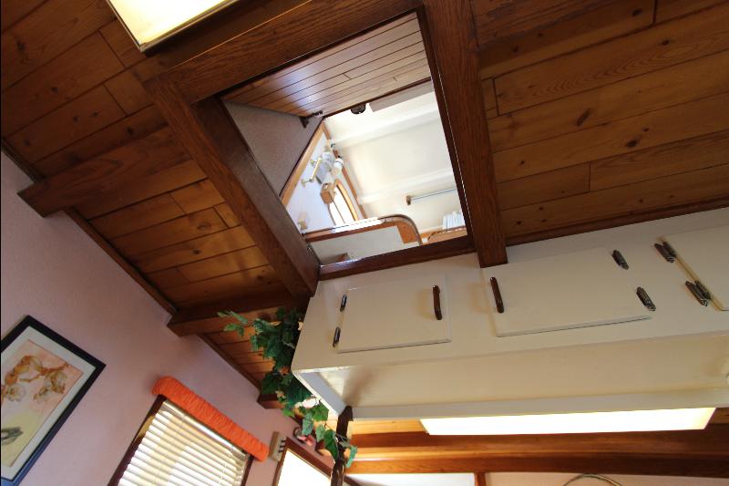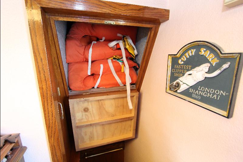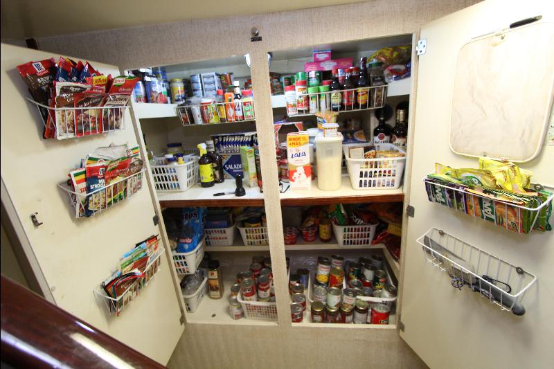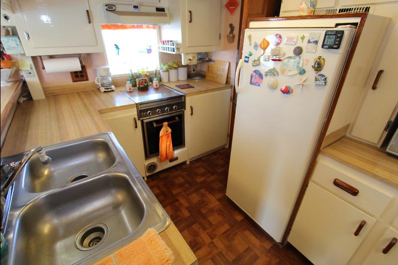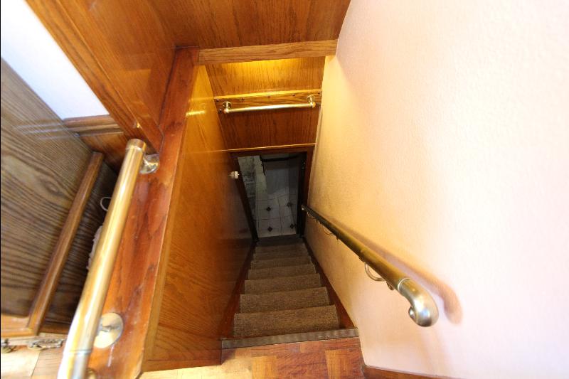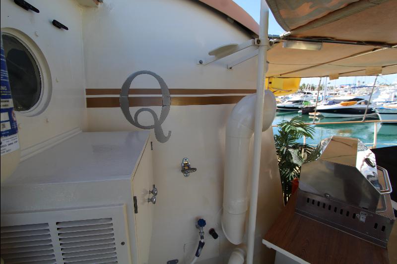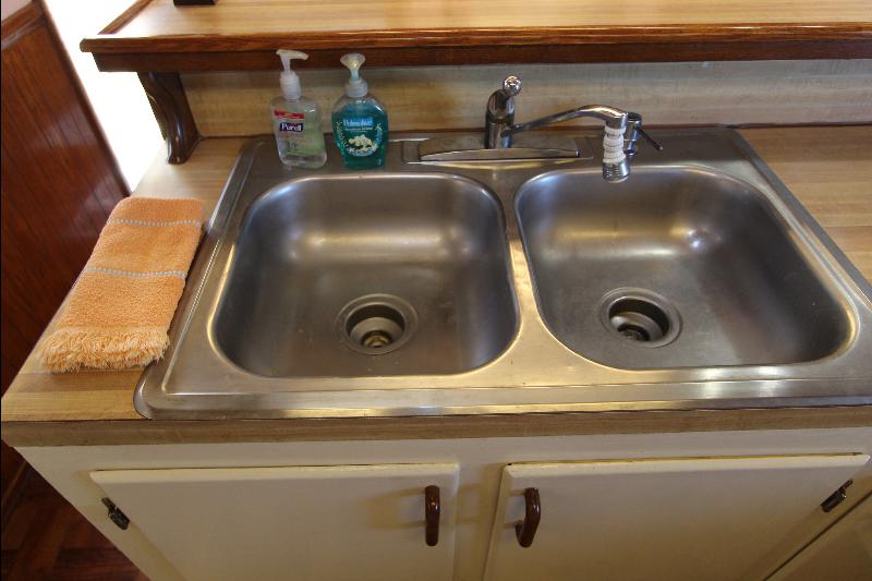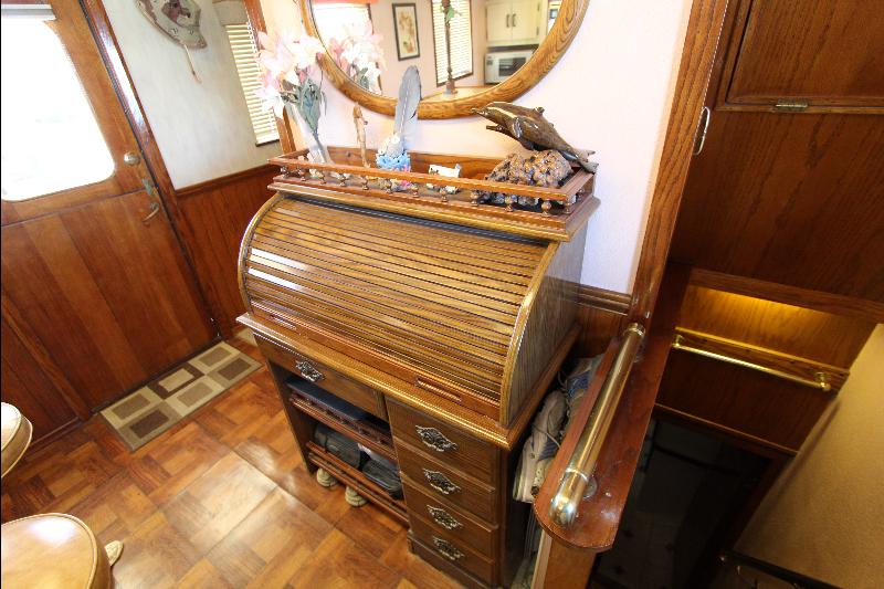 The galley has on the starboard side a stand up refrigerator, freezer and cabinets, on the port side a door that leads to stairs going down to the living quarters forward, a cabinet, stove and a long bench athwart ships with a double sink. Aft of the bench is a long bar counter with 4 stools and side doors to the weather decks. Center behind the bar stools is a roll top desk, on the port side is access to the master state room on the lower deck, aft of the galley is the main salon, with a music center, books, cabinets and an L shaped settee.