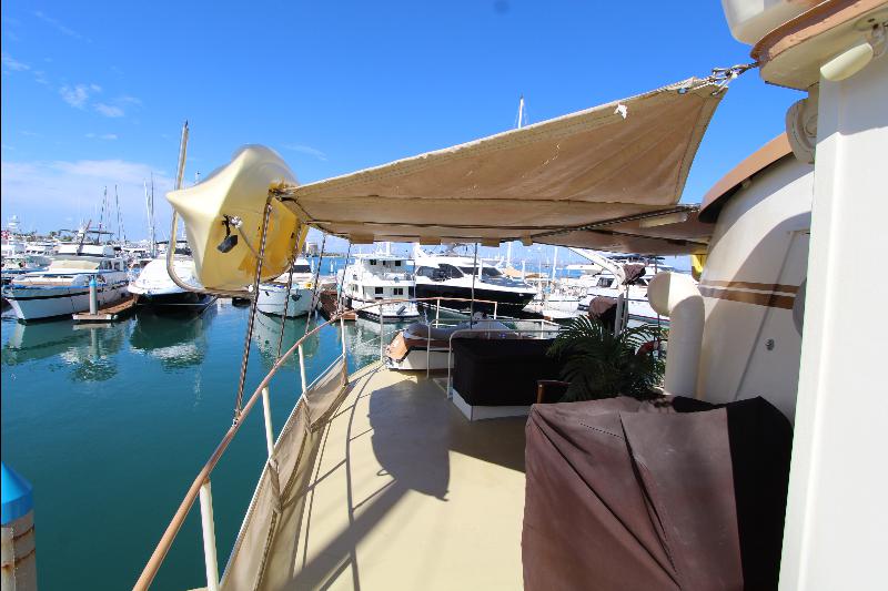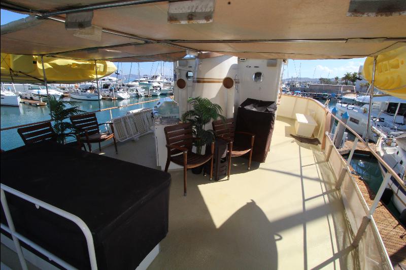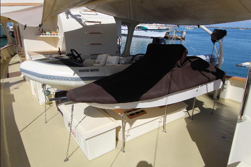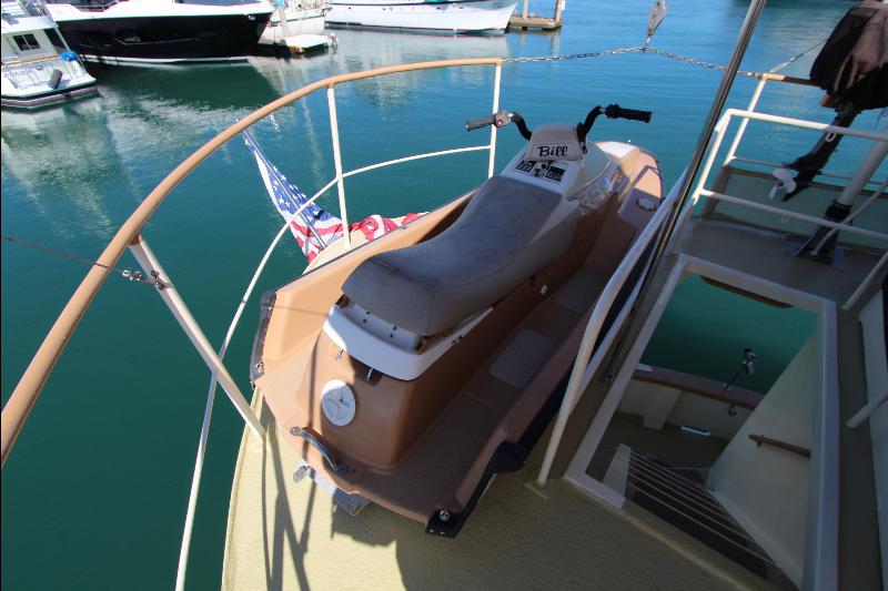 Aft on the upper deck is a wave runner, a dingy hoist, and a deck locker with a generator and emergency engine driven pump, and stairs to the main deck.