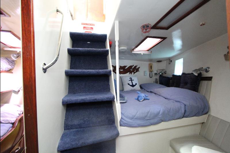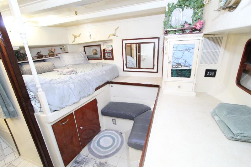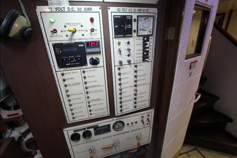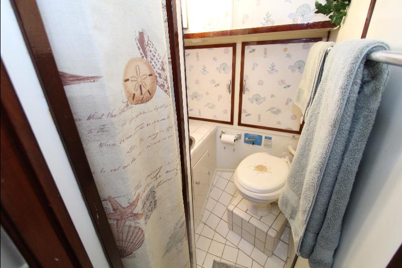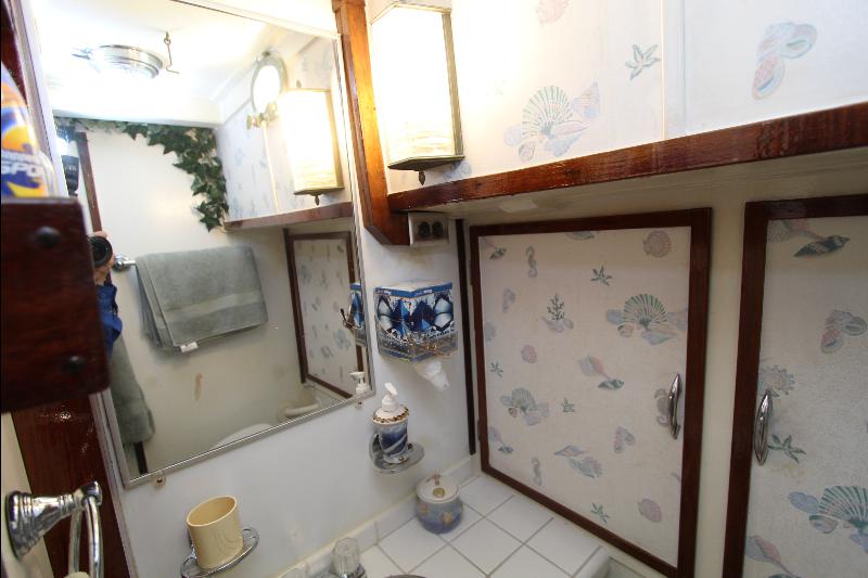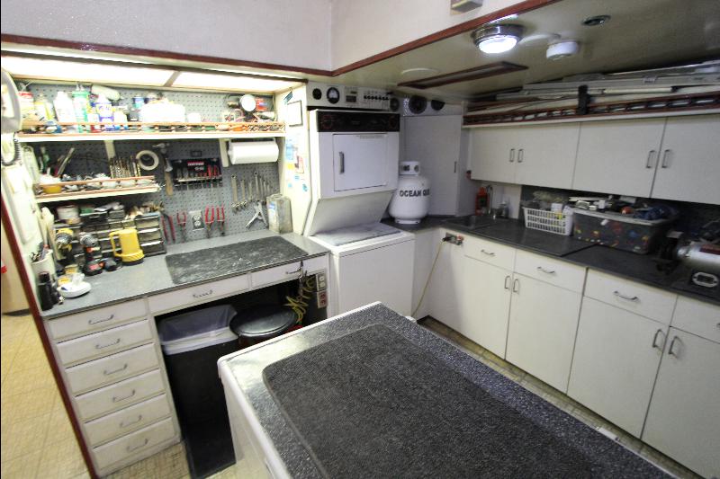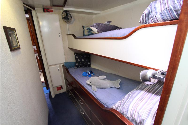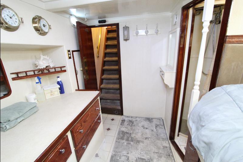 The living accommodations are on the lower deck. Forward is a bathroom with all amenities. Aft of the bathroom on the port side is a state room with a queen sized bed, seat and storage. Aft of the bathroom on the starboard side are a set of upper and lower bunks and cabinets, access to the engine room and the generator room and work shop. Access to the aft state room is aft of the galley. The aft state room consists of a queen sized bed, lockers, draws, vanity, and an L shaped settee and a private bathroom with a vanity with hand basin cabinets, mirror, toilet and separate shower.