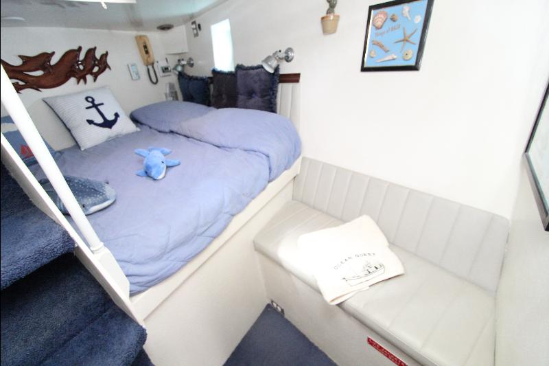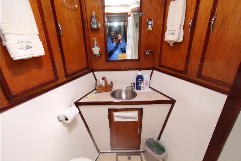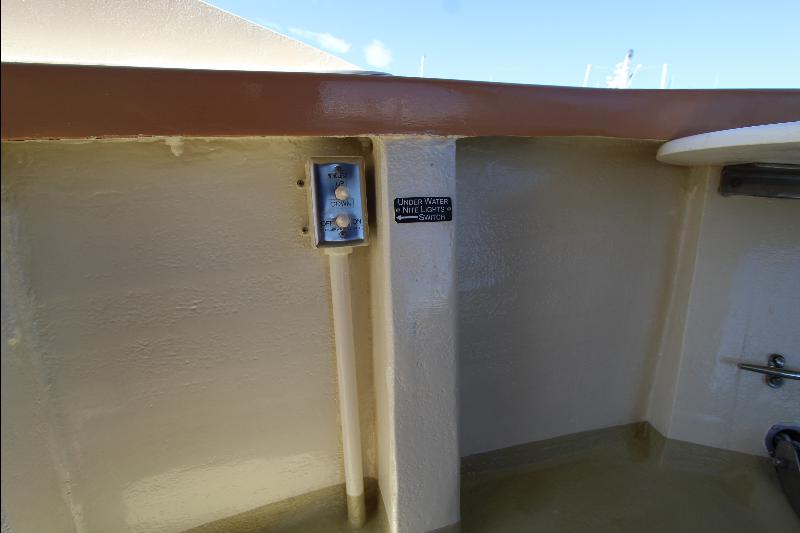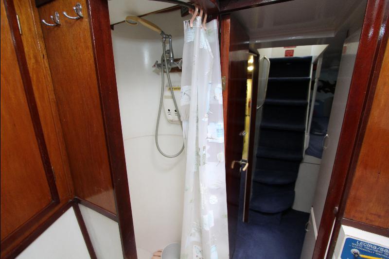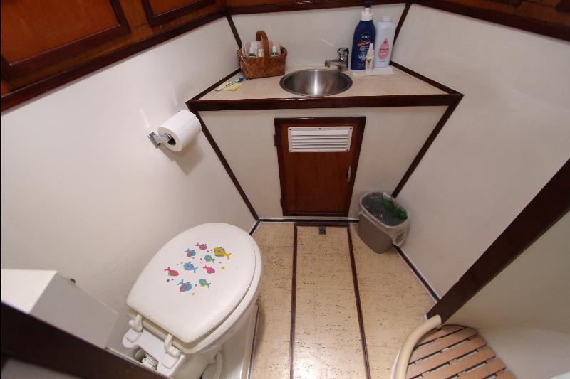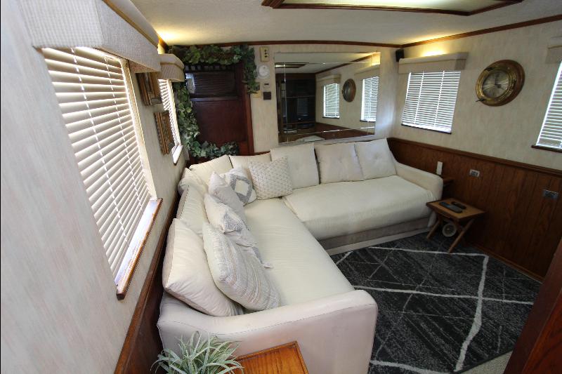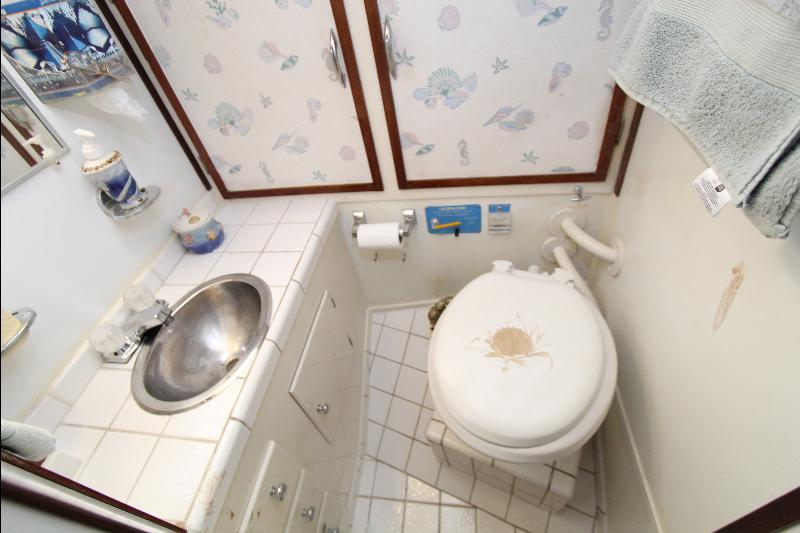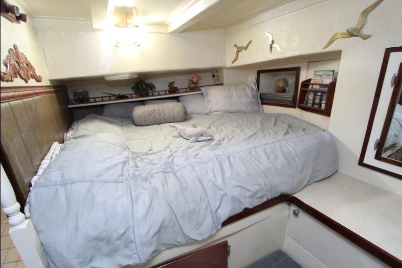 The living accommodations are on the lower deck. Forward is a bathroom with all amenities. Aft of the bathroom on the port side is a state room with a queen sized bed, seat and storage. Aft of the bathroom on the starboard side are a set of upper and lower bunks and cabinets, access to the engine room and the generator room and work shop. Access to the aft state room is aft of the galley. The aft state room consists of a queen sized bed, lockers, draws, vanity, and an L shaped settee and a private bathroom with a vanity with hand basin cabinets, mirror, toilet and separate shower.