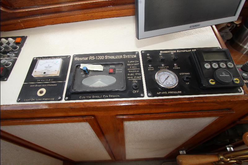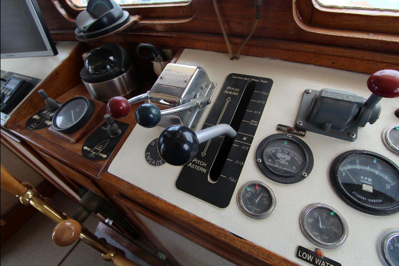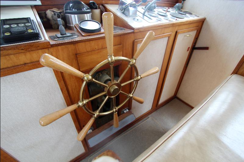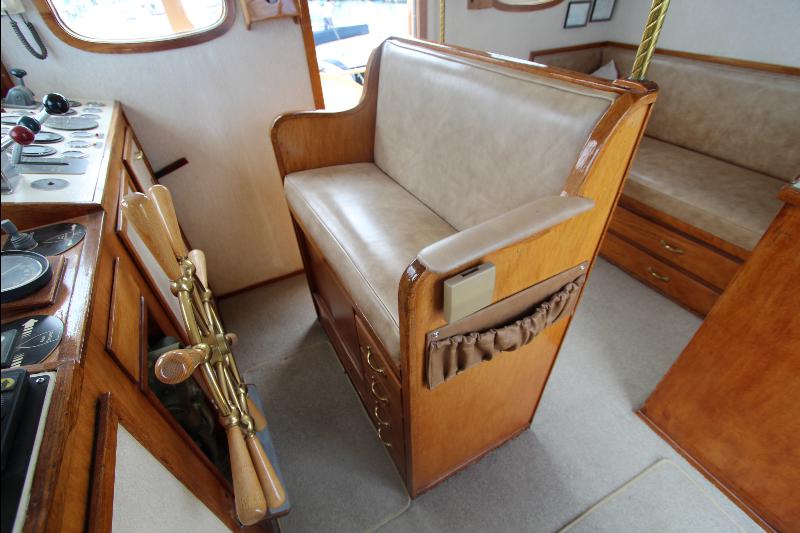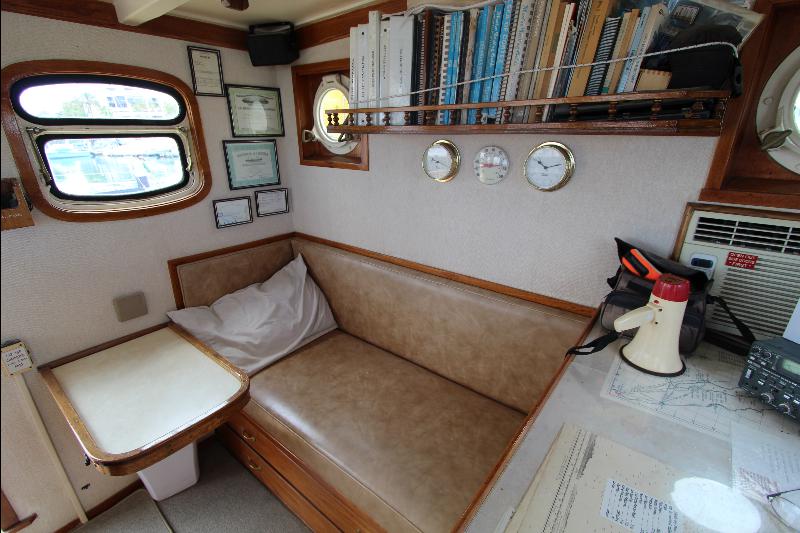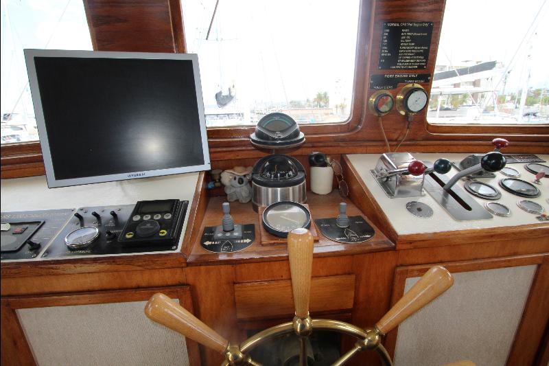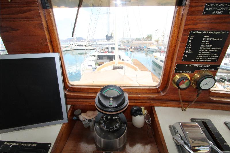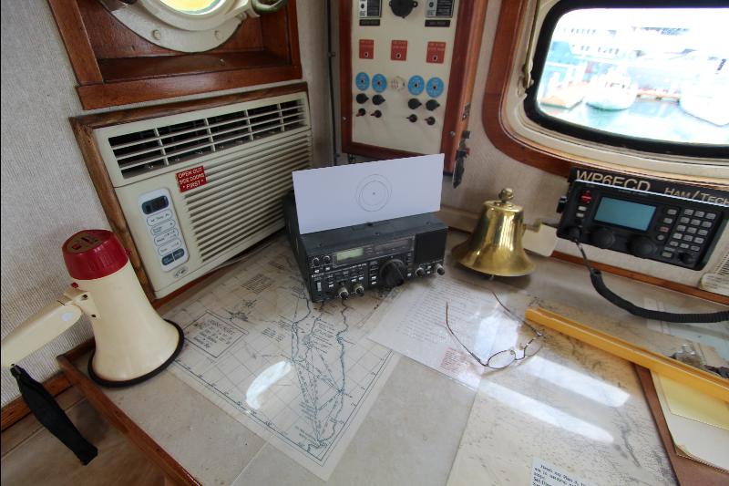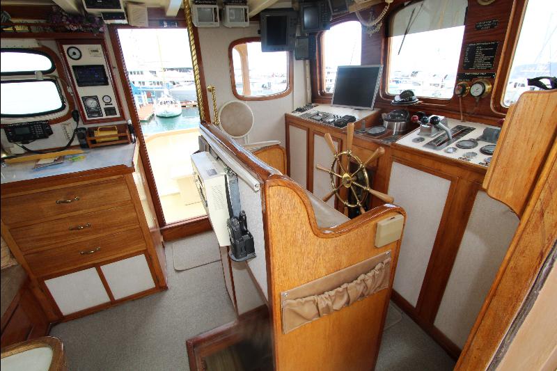 The upper deck has a walk around the wheel house. The wheel house is the control center of the vessel with a full console and steering center, a full set of engine instruments and controls, full set of electronic and navigation equipment with many back up systems, including all ships controls. Aft of the steering station is a bench seat, doors to the side decks, a chart table a small table and a bunk seat aft.